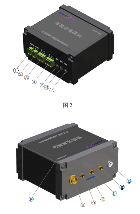 ⑦ 擴(kuò)展模塊數(shù)量選擇撥碼? ? ⑧ 頻率傳感器接口? ?⑨ 藍(lán)牙天線? ?⑩ SD 卡 ? 433 天線? ? ? 4G 天線? ? ? 9-24V 電源輸入? ?? 設(shè)備序列號(hào)