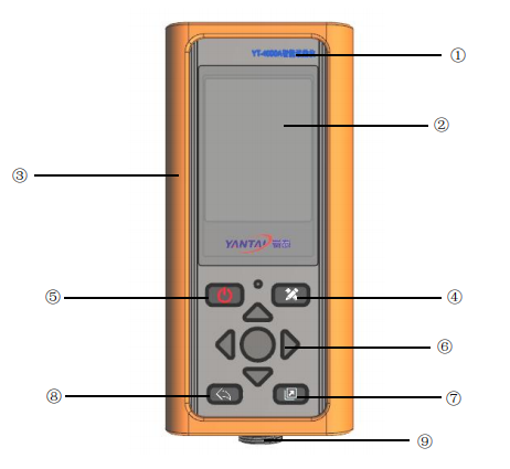 ①鋁合金外殼? ? ? ?②顯示屏? ? ? ? ? ?③硅膠保護(hù)殼? ? ? ? ? ? ?④測(cè)量鍵? ? ? ? ? ? ? ? ? ⑤電源開(kāi)關(guān)鍵